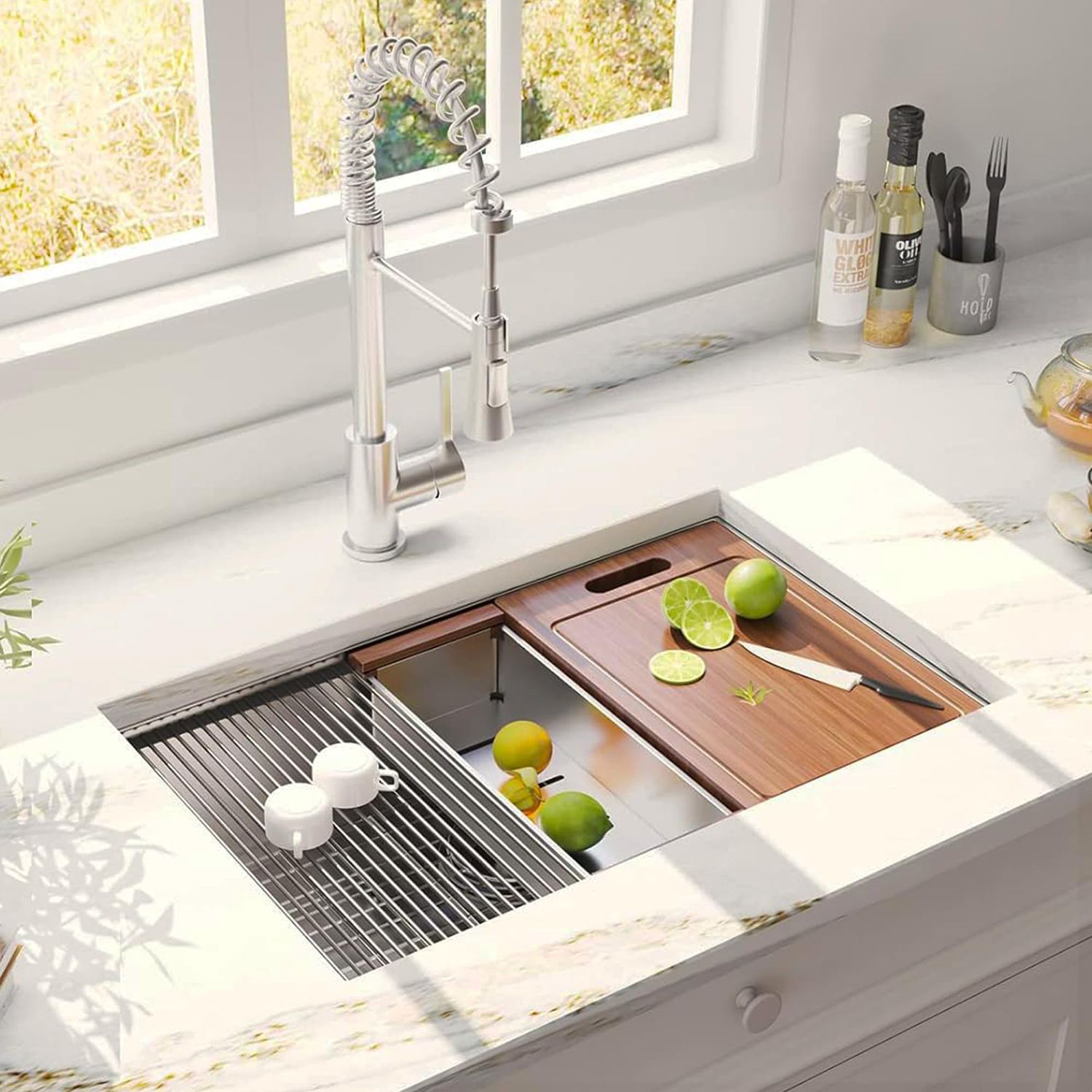 1.WORKSTATION sink with single-tier track - Overhanging lips on the front and back act as a track for sliding the built-in accessories | Includes solid wood CUTTING BOARD, deep STAINLESS STEEL COLANDER, and dish-drying roll-up rack that slide on the ledges converting your sink to a workspace
