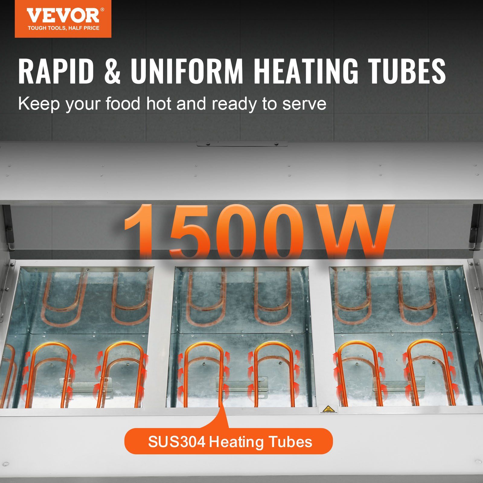 Highlights: 1.Fast Heating, Lasting Warmth: Keep your dishes warm and ready to serve with VEVOR 1500W commercial electric food warmer! Featuring independent knob switch and 304 stainless steel heating tubes in each well, our steam table delivers powerful heating for uniform and rapid heat transfer, preserving the hot and delicious flavors of your food for longer. 2.3 x 20.6 QT Large Food Pans: Serve up to 3 different dishes simultaneously in our 3 spacious food pans! Each pan is 5.9-inch deep and comes with lid and handle, making it easy to access to food for your guests. Keep your guests satisfied with piping hot steamed vegetables, juicy hot dogs, crispy bacon, and more. 3.Independent Heating System: One knob switch controls one food pan. You can set the temperature independently for each pan to ensure optimal freshness and flavor. Our food warming table operates without the need for water, using air heat transfer for safe and convenient heating. Preheat for 10-20 minutes before heating delicious food. (This steam table is intended only for dry use). 4.Acrylic Sneeze Guard: We have improved overall food safety by adding a clear sneeze guard to the front of the buffet server. It effectively protects the food from moisture and droplets in the air, ensuring a safer dining experience for all guests. 4 flexible casters (including 2 lockable) offers easy movement and stable positioning. 5.Multi-Purpose Food Warmer: Featuring a PE processing table, our 3-pot steam table provides additional workspace for convenient food preparation, cutting, and more. Furthermore, its durable bottom shelf offers ample storage for utensils, food pans, ingredients, and seasonings, keeping everything you need within reach.