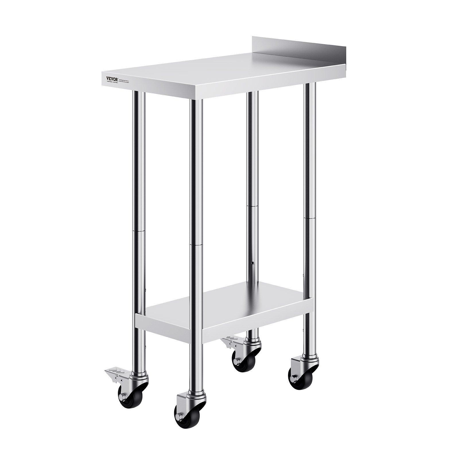 4.User-Friendly Design: Featuring 3-level adjustable shelves, this work table offers the most user-friendly and practical functionality. Simply adjust the shelf height with screws to accommodate items of different sizes. Equipped with 4 swivel casters, including 2 with brakes, the table remains stable and can be easily moved to any location. The high rear backsplash prevents items from falling off and guards against water splashes.