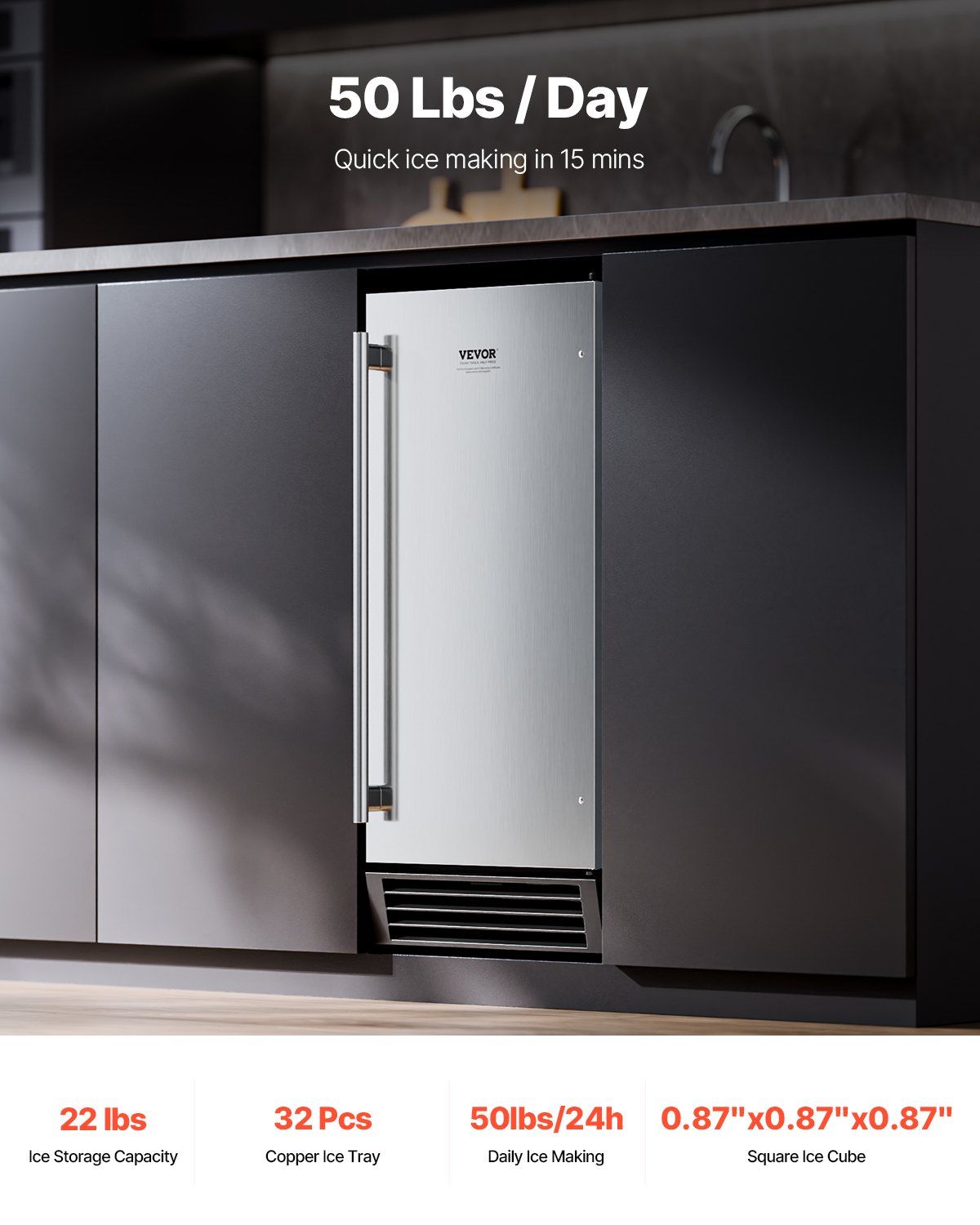 1.Fast Ice Making & Large Ice Storage: Our undercounter built-in ice maker can produce up to 50 lbs of ice within 24 hours and store up to 22 lbs. It features a 32-cube copper ice tray, making square ice cubes (0.87x0.87x0.87 inch) in as fast as 15 minutes. Ideal for home use or parties.