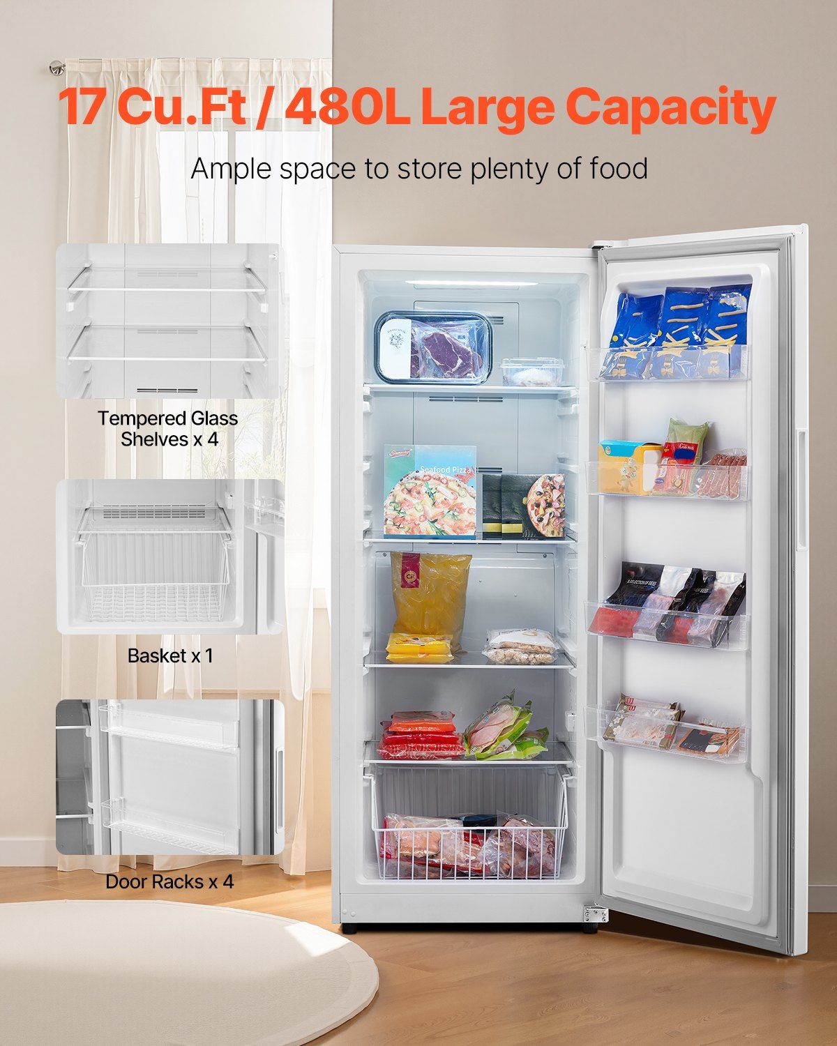 2.17 Cu.Ft / 480L Large Capacity: This upright freezer offers a large capacity to store a wide variety of food items. The 4 adjustable shelves can be moved to suit your needs, while the basket and door racks are ideal for smaller items. The interior is equipped with LED lighting for easy access.