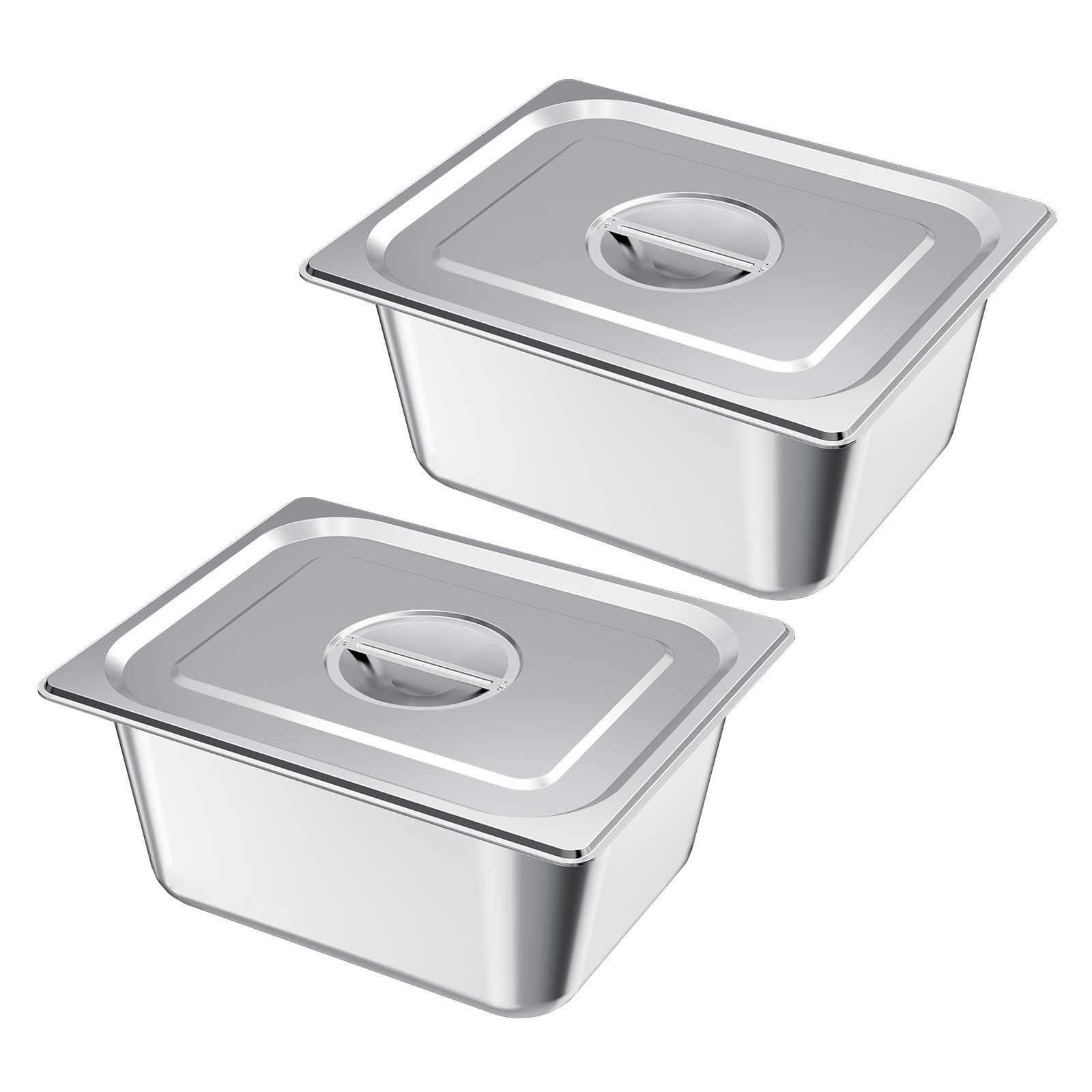 2.Ample Food Capacity: This 1/2 size Stainless Steel Hotel Pans set (6 inch deep, 2-pack with lids) provides 9 L / 36 Qt of capacity, meeting your everyday cooking needs. Ideal for cooking, storing, and serving food, it's great for holding meat, vegetables, fruits, ice cream, and more