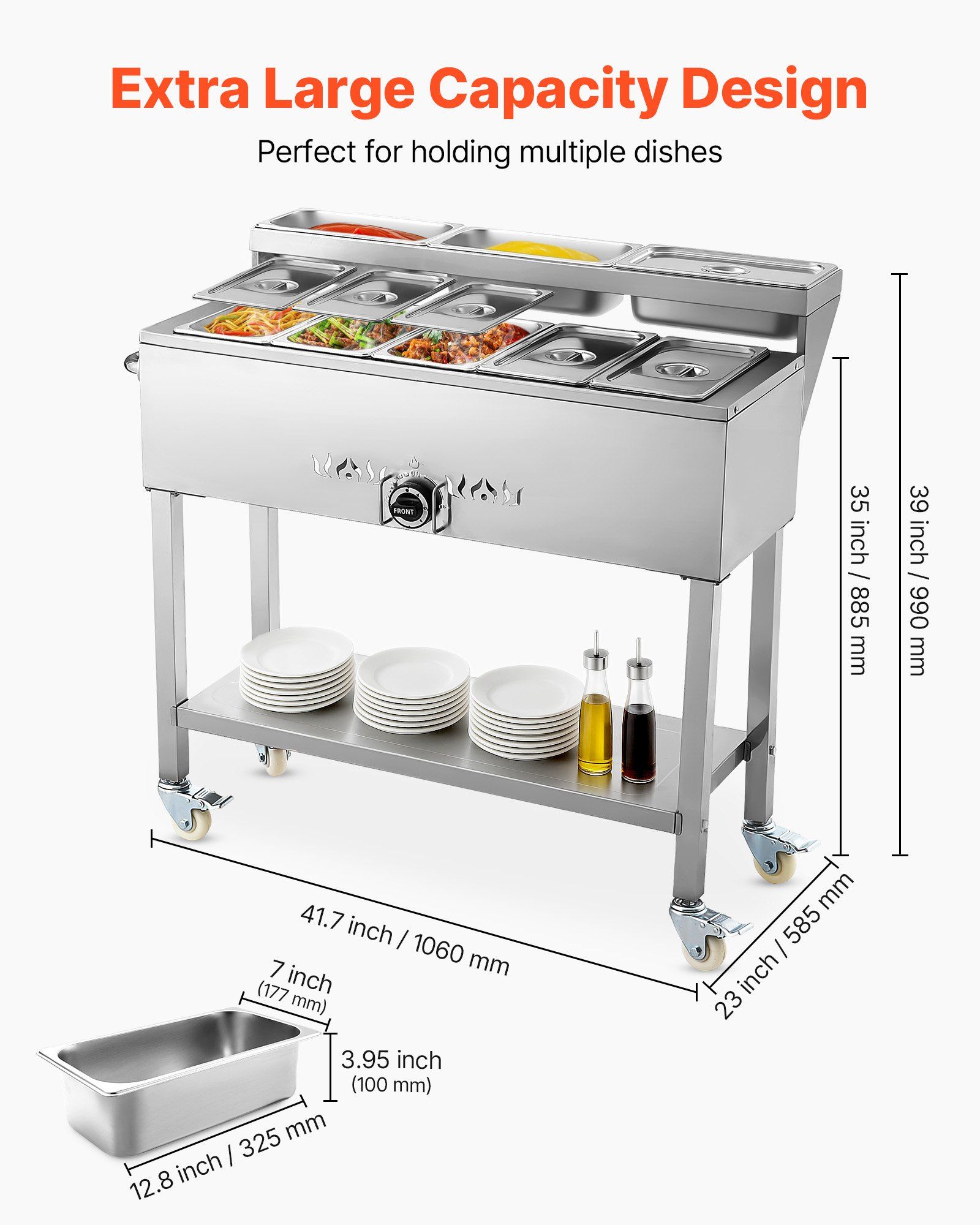2.Large Capacity: Measuring 41.7 x 23 x 39 inches, this propane food warmer includes 5 standard 1/3-size pans with lids to keep food warm. Supports easy replacement of pans up to 4" deep, providing flexibility for various dining needs and occasions